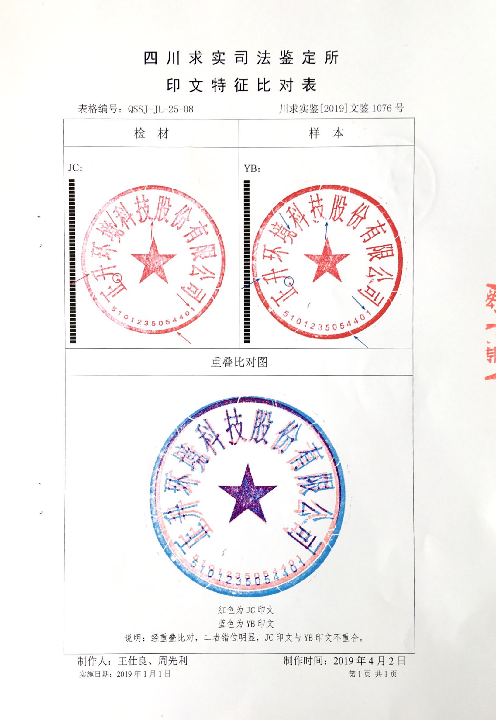 我公司于2019年3月22日向四川求實司法鑒定所提交證據進行司法鑒定。經鑒定,四川求實司法鑒定所出具《川求實鑒【2019】文鑒1076號》印章鑒定意見書,意見為:私刻印章在印文直徑、暗記漏白線性標識痕跡數量、位置、形態(tài)、角度;印文文字與印文邊框的距離等特征均與我公司合法公章存在本質性差異。